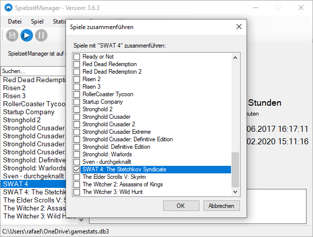 Es können mehrere Spiele zusammengeführt werden. Wähle dazu das gewünschte Spiel aus, das als Basis für das zusammengeführte Spiel verwendet werden soll und klicke auf „Spiel“ und „Spiel zusammenführen“. Es öffnet sich ein Dialog, in dem du weitere Spiele auswählen kannst.